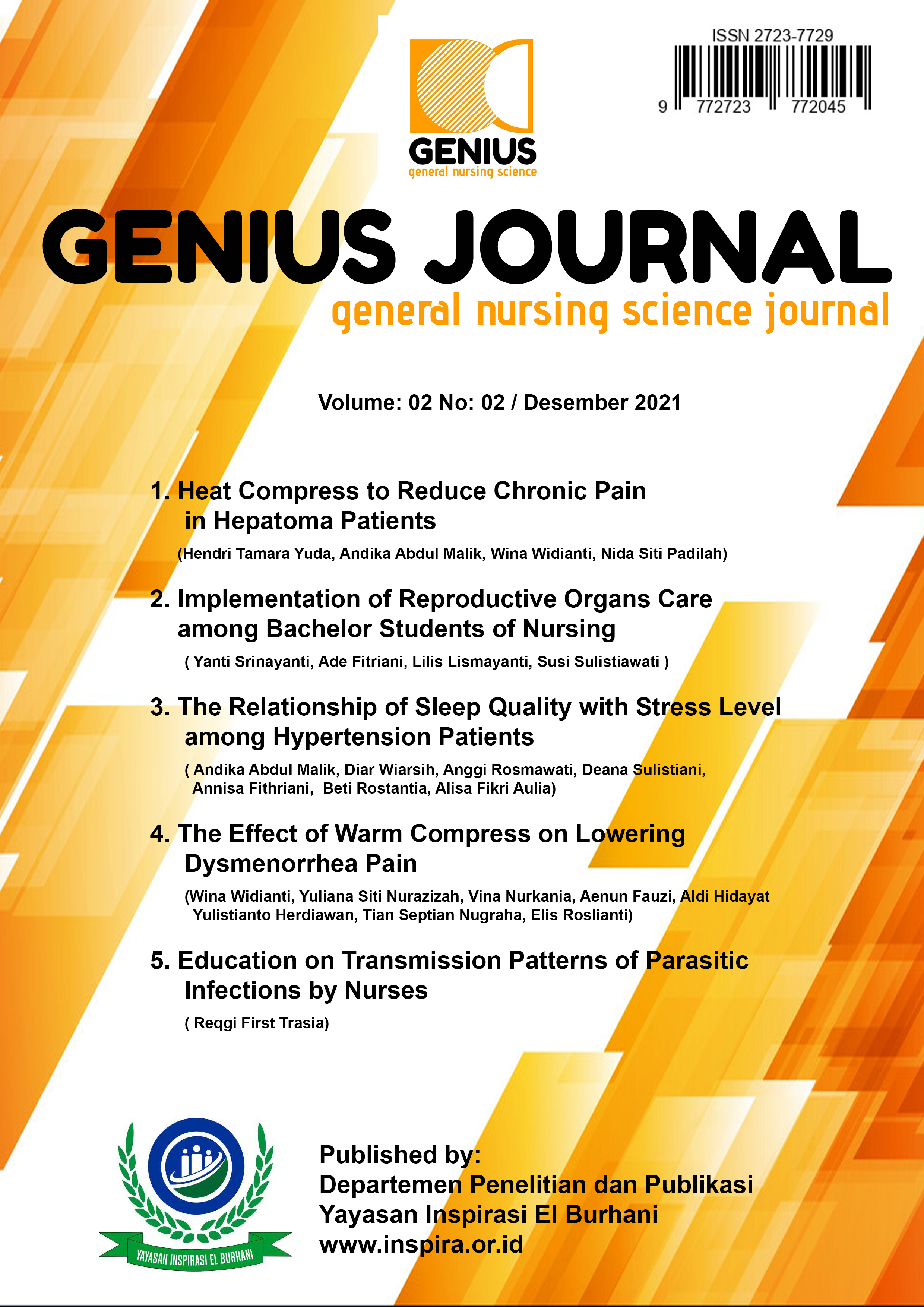 Genius Journal is a scientific journal that disseminates research results on the development of science and technology in the field of nursing. This journal facilitates nurse researchers, nurse educators and nurse clinicians from around the world to share information on research findings and experiences in providing nursing services. Genius invited researchers to submit their research results in the form of original articles, literature reviews, systematic reviews, meta-analyzes and case studies. Submitted research articles are expected to make positive impact and contribute in improving the quality of nursing services and healthcare system. Genius has a mission to promote excellence in nursing and health care through the dissemination of evidence-based, peer-reviewed clinical information and original research, discussion of relevant and controversial professional issues, adherence to the standards of journalistic integrity and excellence, and promotion of nursing perspectives to the health care community and public.